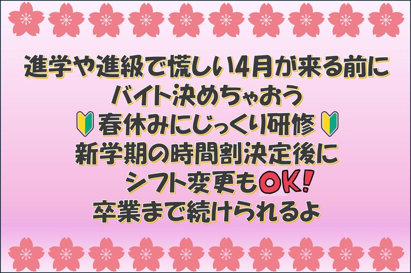 求めている人材 ✅未経験者歓迎 ✅年齢不問 ✅バイトデビューの学生さん、フリーターさん、ブランク復帰の方など大歓迎! 経験や年齢は一切問いません! “明るい挨拶”ができる方なら活躍いただけます♪ 【こんな方にピッタリ】 ・人と話すことがが好き ・人の笑顔を見ることが好き ・コツコツと丁寧に作業を進められる ・学校、家庭、本業などと両立したい ・安定した環境で長く働きたい \⭐丁寧に研修します/ 事前の研修では接客マナーや レジ操作について丁寧にお教えします。 何度も確認できる研修動画もありますよ♪ 実際の現場で困った時は、 先輩スタッフがフォローしてくれるので安心です! \⭐学生さんにもおススメ/ 自然と身に付く言葉遣いや身だしなみや気配り、 社会人としてのマナーが身につきます! 就活にも活かせてコミュ力もアップ!