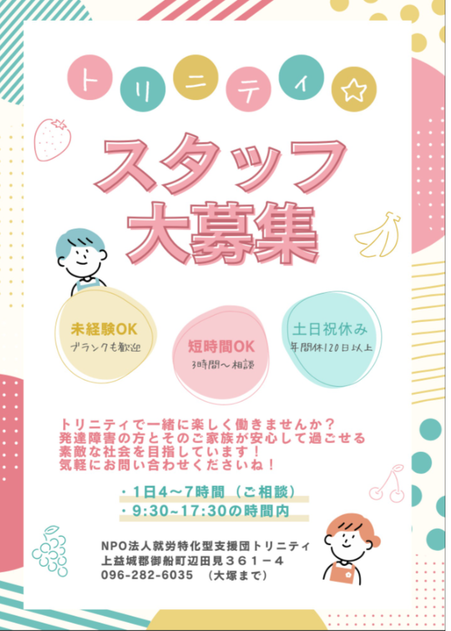 仕事内容 ★─────────────────★ ✨✨✨アピールポイント✨✨✨ 私達「NPO法人就労特化型支援団トリニティ」は、スタッフの働きやすさを第一に考えています。 子ども達が大人になったときに社会で活躍できるよう、子ども達の未来を見据えたアプローチを日々模索し、実践していますので あなた自身の成長にもつながっていきますよ◎ ✅未経験の方も大歓迎! ✅子育て中の方も応援します♪ ✅充実の研修制度で成長をサポート ✅基本土日祝休み!日数・時間も相談可◎ ✅有資格者には手当支給! ✨具体的なお仕事内容✨ +:+ 支援員を募集します! :+:+ 主に利用者様(小学生くらいの子ども)の見守り、サポートをしていただきます♪ 室内療育を中心とし、不登校支援などを行っています。利用者様と一緒に工作などを行っています◎ 七夕やハロウィンなどのイベント、季節ごとに飾りつけをするなど、アクティブに活動しています! 小人数のクラスで、子ども1人1人に合ったサポートをお任せするので、 心に余裕をもって働けるところも魅力の一つです✨ ●仕事スケジュール● ・9時30分 出社 準備、朝礼 利用者さんの申し送り(昨日の業務の報告、保護者の方の声の共有、情報共有) ・10時~ B型の方の見守り、利用者様と一緒に軽作業(工作)など ・12時~ お昼休憩(1時間)利用者さんと一緒にが版を食べてたり、皆さん自由に過ごされています!! 〈午後〉 ・13時~ 利用者さんの見守り 放課後デイサービスの受け入れ準備 ・14時~ 送迎 ・15時~ 利用者さんの見守り ・17時30分 終業 当施設は就労支援・TEACCHプログラムによる療育 などを提供しております。 発達障害に特化した 放課後等デイサービスと 就労継続支援B型の福祉サービスを運営し 専門性の高い支援を行っております。 働きながら専門知識も 身につけることができる環境です◎ ◆放課後等デイサービス業務 個別の療育を中心に、コミュニケーションスキル、感情のコントロール、自立行動を育てていくプログラムを提供してます。 ◆就労継続支援B型 「一般就労を目指すB型」として、職業スキルや自立スキル、対人スキルや機能的コミュニケーションなどが学べるプログラムを提供しています。 ※雇用期間の定めなし ※転勤なし ・ …━━━☆ 経験不問! ・…━━━☆ ◆少しでも気になった方は、まずは職場見学へお越しください。あなたにお会いできることを楽しみにしています◎