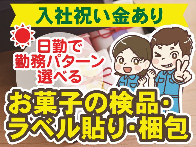 快適職場でお菓子の検品・ラベル貼り・梱包などの軽作業 日勤/勤務パターン選べる/入社祝い金あり