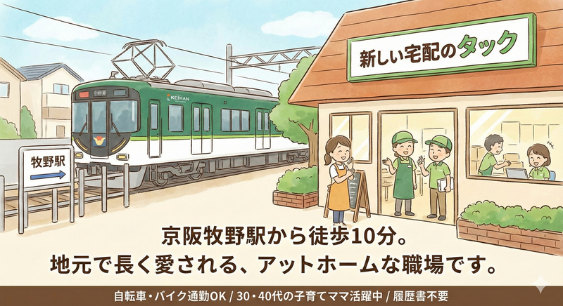 仕事内容 ▼ここが魅力! ・午前のみ3.5時間(10:00〜13:30)で無理なく勤務 ・扶養内勤務大歓迎! ・平日のみ!土日祝休み&急なお休みも柔軟対応 ・対面での接客なし◎ ・30代、40代の子育てママさん活躍中! ・服装・髪色・ネイル自由♪ブランク歓迎 ・京阪「牧野駅」徒歩10分&自転車通勤OK \「牛乳屋さん」のオフィスで、地域を支える一般事務/ 地元で親しまれる宅配サービスを支える、サポート業務です。 【主な業務内容】 ・電話応対(社内・既存取引先からの問い合わせ中心) ・注文データの入力(Excel・専用ソフトへの商品データ入力) ・顧客情報の入力・更新管理 ・書類整理や伝票の仕分けなど ◎難しい業務はありません。PCの基本操作ができればOK! ◎入社後は、ベテランスタッフと一緒にソフトの操作から研修します。 ◎久しぶりのパートも応援します! ◎正社員や事務の経験が無くてもOK! 【こんな方にぴったり】 ・短時間勤務で子育てと両立しながら働きたい ・扶養内で働きたい ・静かな環境でコツコツ作業したい ・対面での接客は苦手 ・地元で長く働きたい
