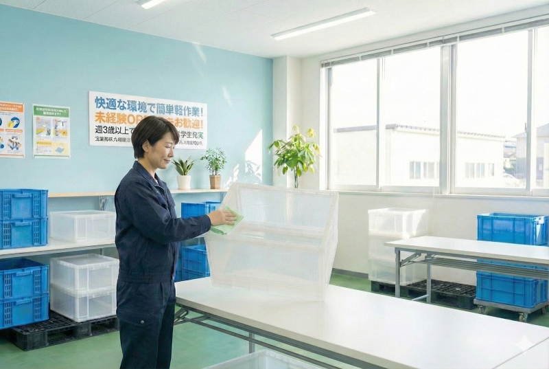 仕事内容: 空調が整ったキレイな倉庫内で、 自動車部品が入っていたプラスチックケースやプラスチック段ボールの拭き掃除をしていただくお仕事です。 ※水を使った洗浄作業は一切ありません。 ▼主なお仕事 * プラスチック段ボールを布でサッと拭く作業 * プラスチックケースの簡単な清掃(ケース内のゴミ取り など) * 指示に沿って行うシンプルな軽作業 どなたでも始めやすい、とても簡単なお仕事です。 ▼働く環境 * 空調完備で一年中快適な環境 * 作業スペースは整っており、安心して働けます * 土日休みのシフト制で、プライベートとの両立も◎