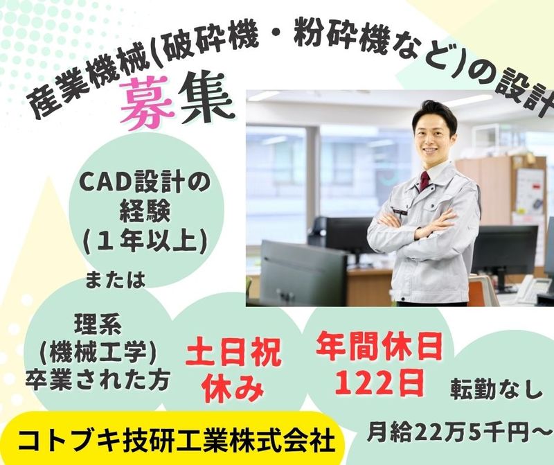メッセージ ◆産業機械の設計募集◆ ・大学で機械工学を学んでいた方 ・CADや設計の経験がある方は 知識を活かすことが出来るチャンス? ◇――――――――――◇ コトブキ技研工業株式会社は コンクリートやアスファルトの原料となる 大きな岩石を小さく均一な砂の粒に砕く 高い技術を持つ、産業機械の 国内トップメーカーです ◇――――――――――◇ ■土日祝休み・年間休日122日 ■賞与 年2回あり ■資格取得支援制度あり などなど福利厚生も充実!! 社員同士の仲が良く 先輩後輩の垣根をこえて 相談しやすい雰囲気が魅力♪ 離職率も低く 働きやすい環境が整っているので 長く腰を据えて働きたい方に ピッタリ◎ ▽▽▽▽▽▽▽ ☆こちらのお仕事は 企業様からお預かりし 転職エージェント『しごと計画学校』が ご紹介するお仕事です ※応募先は『しごと計画学校』となり 雇用先は紹介先の企業様となります 『しごと計画学校』については 下記「その他欄」に記載しておりますので ご参考ください CAD設計の経験者、又は機械工学卒業された方土日祝休み/年間休日122日\20代~60代の12名が在籍中/ 職業紹介事業(33-ユ-300208) 労働者派遣事業(派33-300443)