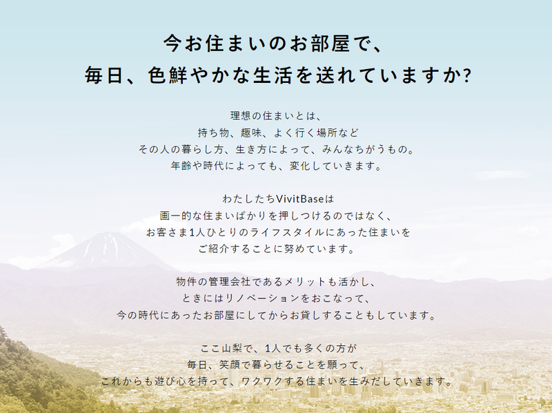 仕事内容 お仕事内容▼  ̄ ̄ ̄ ̄ ̄ ̄ ̄ ̄ ̄ ̄ ̄ ̄ ̄ ̄ ̄ 当社受託物件の管理や各業者様の手配、 見積・請求対応などのお仕事をお任せ致します◎ <具体的には・・・> ✅管理物件の定期的な巡回 ✅各種工事業者の手配 ✅簡単な修繕作業 ✅見積・請求の対応 ✅マネジメント などの業務をお任せします。 ≪経験者・管理職・幹部候補募集!!≫ 不動産管理業務の経験者の方、 これまでの経験を活かして思う存分力を発揮できます!! 当社について▼  ̄ ̄ ̄ ̄ ̄ ̄ ̄ ̄ ̄ ̄ ̄ ̄ ̄ ̄ ̄ 株式会社VivitBaseは、 全ての人と不動産の個性に向き合い、 一人一人に合った不動産を提供する会社です。 不動産活用や売却、購入、管理、 リフォーム・リノベーション工事など、 一般的な不動産業務はもちろんのこと、 宿泊事業、イベント事業、観光事業など 不動産会社の枠にとらわれない事業展開 も行っており、誰もが楽しくイキイキと した生活できる地域社会の実現を目指しております。