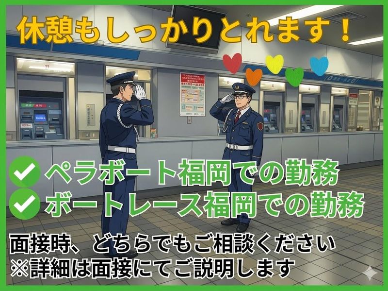 仕事内容 ⭐===============⭐ 未経験OK✨ミドル世代活躍中 月収21万7000円以上も可能★ ⭐===============⭐ \ 警備スタッフ募集中 / 若手~中高年・40代・50代や60代まで、幅広い年代が活躍中! 警備のお仕事が初めてでもOK★難しい業務はありません! 来場者のみなさんが安心して楽しめるよう、陰で支えるお仕事です♪ \ 未経験スタッフ多数 / 警備隊長も最初は警備スタッフからスタートしました! チーム体制での警備のため、初めてでも心配ありません。先輩がしっかりサポートしますよ◎ 「久々の仕事復帰」「警備業務が初めて」という方も安心できる環境です♪ ✨発券機の現金・舟券の取り忘れなどの注意喚起 ✨駆け込み舟券購入者への案内 ✨不良行為防止のための館内・外の巡回 など、お客様を見守りながら、施設全体が安全で快適に利用できるようサポートをお願いいたします★ \ こんな瞬間がやりがいに / 警備の仕事は「安全を守る」だけじゃないんです! お客様からいただく「ありがとう」「お疲れ様です!」といったお声がやりがいにつながります。 ✨ちょっとした心遣いが大切✨ ▶︎車いすのお客様にエレベーターをご案内したり、重い荷物をお持ちのお客様にコインロッカーをおすすめしたり… ▶︎業務中は警戒業務を中心として、小さな気遣いの対応も必要となります! こうした温かい経験が、仕事を続けるモチベーションになります◎ \ この仕事の魅力 / ★夜勤なしで安心勤務◎ ★週3日~OKの自由なシフトでプライベート充実! ★AEDの使い方を学べるのでスキルアップにも! ★学生さんに人気のお仕事もアリ! 詳細はお問合せください。 「体を動かしたい」「健康維持をしたい」という方にもおすすめです♪ <入社の流れ> 面接予約 ↓ 面接(選考1週間程度) ↓ 採用(各書類を集めていただく) ※会社指定病院での受診 ↓ 入社(新人警備員教育3日間) ↓ 現場研修 ✨- 株式会社コアズについて -✨ 昭和49年8月の創立以来、警備業をはじめビルメンテナンスやオートサービスなど多彩な事業を展開し、今では全国に34拠点!従業員数6400名! ボートレース福岡、大手銀行、イオンモールでの施設警備やショッピングセンター・ホームセンター・みずほPayPayドーム福岡等の駐車場案内警備、花火大会・駅伝・マラソン大会等の雑踏・交通誘導警備、建設現場での交通誘導警備、コンサート等のイベントでの警備を行っております。 創業50年以上の安定した成長を続ける企業です。