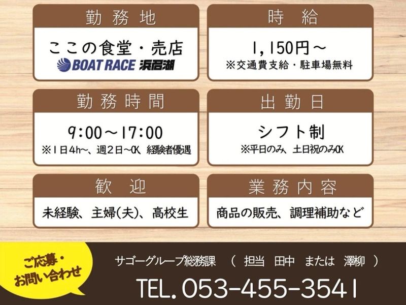 仕事内容 //////////////////////////////////////// Wワーク歓迎♪ 週末の余った時間を使って副収入! 未経験OK!簡単な作業で覚えやすい♪ //////////////////////////////////////// 【アピールポイント】 ◆週1日OK!1日4h~OK!シフト融通バツグンです◎ ◆40代、50代、60代活躍中! ◆平日のみ・週末のみでもOK♪ ◆髪色・髪型自由!オシャレしながら働けちゃう! ◆車通勤OK!うれしい無料駐車場完備! ◆電車通勤の方はJR新居町駅直結! 【具体的なお仕事内容】 ボートレース浜名湖内「ここの食堂・ここの売店」「みなみ食堂・みなみ売店」の簡単な調理補助・食器洗浄や接客、売店での販売をおまかせします! 食堂は券売機で食券を購入していただくスタイルなので接客も少なめ! 食器返却口に戻った食器を洗浄するため、ホールを回っての片付けなどは無し! 売店はドリンクやお弁当・ホットスナックなどの簡単な販売業務のみ♪ シフトの融通も利くので、学校や家庭などプライベートと両立しながらお小遣い稼ぎも可能です◎ Wワークの方や学生さんなど、週末しか勤務しない方でも覚え安いお仕事内容です。 ボートレースは年間200日開催! シフトに入る日も予測を立てやすいのでプライベートとの両立もしやすいですよ♪