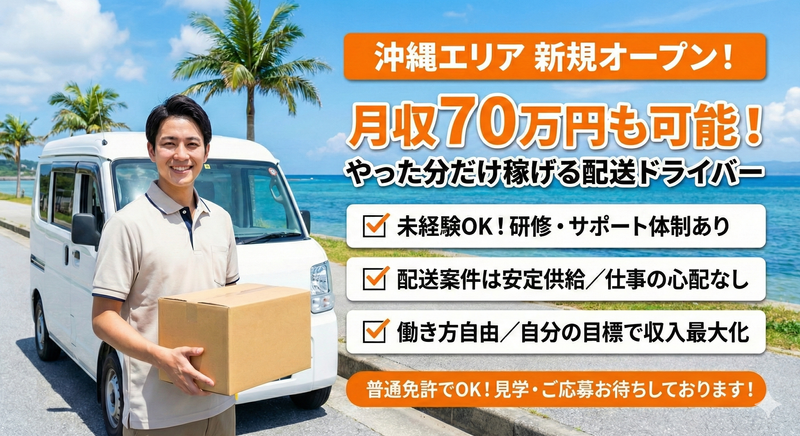 仕事内容 【ここがポイント!】 ★ 月70万〜80万円以上の高収入実績あり/配送件数=収入に直結 ★ オープニング募集!人間関係ゼロからスタート ★ ジム・英会話・資格取得など自己投資を会社が応援 ★ 夢・目標に合わせて福利厚生を個別カスタマイズ ★ 車両リースあり/未経験・車なしでもすぐ挑戦可能 ★ 「何者かになりたい」人を本気で応援する会社 【仕事内容】 個人宅・企業向けの軽貨物配送をお任せします。 配送件数に応じて報酬が決まるため、やった分だけ収入に直結する仕事です。 当社が目指しているのは、 単なる「稼げる配送」ではありません。 「稼ぐ → 自己投資 → 成長 → 次の夢へ」 このサイクルを会社が仕組みとして支援しています。 自由な時間を、 ジム・語学・資格取得など未来につながる学びに使える。 配送をしながら、次のステージを目指せる環境です。 <主な業務> ・軽自動車での荷物配送 ・荷物の積み込み、仕分け ・配送ルートの確認 ・個人宅・企業への配達 ・簡単な報告・連絡業務 ・希望者は配送件数アップの調整も可能 ※重たい荷物は少なめ/未経験スタート多数 ※車両をお持ちでない方はリース利用可 【1日の流れ】 ・営業所または指定場所に集合 ・午前便の荷物を積み込み ・配送ルート確認 ・午前中の配送業務 ・休憩(自分のタイミングでOK) ・午後便の集荷・積み込み ・午後の配送業務 ・配送終了後、業務報告して終了 ※早く終わればその分早く帰れます ※午前・午後で集荷があるため、安定した配送量を確保できます ※空いた時間を学習・トレーニングに使うスタッフも多数 【入社後の流れ】 まずは先輩ドライバーと一緒に業務を行い、 配送の流れ・コツ・稼ぎ方を丁寧にレクチャーします。 慣れてきたら ・配送件数を増やして収入アップ ・自由な時間を使って自己投資 ・目標に合わせた福利厚生(成長支援)を個別設計 ジム補助・英会話補助・資格取得支援など、 あなたの「なりたい姿」に合わせて会社が支援します。 車両リースを利用してのスタートも可能なため、 初期費用を抑えて挑戦できます。 「何者かになりたい」「今の自分を変えたい」 そんな想いを持つ方を、私たちは歓迎します。