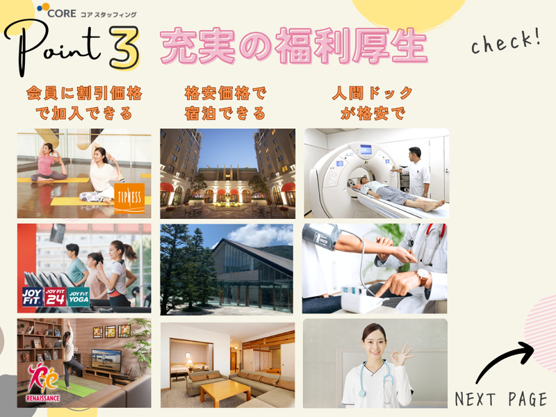 【保険制度】 雇用保険、労災保険、健康保険、厚生年金 待遇・福利厚生 【福利厚生】 【試用期間】 2ヶ月 労働条件は本採用と同じです。 【保険制度】 ・健康保険 ・厚生年金 ・雇用保険 ・労災保険 <充実のワークライフバランス> ・福利厚生施設が全国99施設 箱根や京都、ハワイ、浦安の高級ホテル10万円のお部屋借上で1泊6,000円! ジム・フィットネス・ゴルフクラブなどが割引価格に! ・高級レストランビッフェ26%OFF ・旅行補助金制度あり ・ドーム遊園地55%割引 ・治療がどんなに高額になってもの医療費の自己負担が月2万円まで ・出産一時金の追加支給で600,000円 ・医薬品、ワクチン団体割引制度 ・健康診断会社負担 ・人間ドック受診制度(約5,000円) ・資格取得支援 ・表彰制度 ・提携研修機関 約300種類テーマの研修をオンラインで無料受講可能
