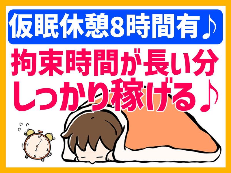 職場環境 皆さん仮眠・休憩時間は自分の好きな動画を見たり、お話したりと自由に過ごしています☆ 拘束時間が長めですが、その分次の日はお休みになりますので、 なんだかお得な気分になるのも好評♪