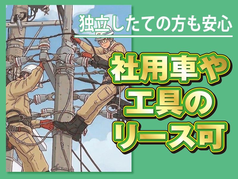仕事内容 ✨稼ぎたい方、大歓迎!✨ 安定して仕事があるため、当社の業務を委託できる方を大募集! 経験豊富な方はもちろん、「独立したばかりだからどんどん依頼を受けたい!」という方も大歓迎です。 社用車や工具の有料リースもOKですので、道具などが揃っていない方もお気軽にご相談ください。 ■■■通信作業工事スタッフの募集■■■■ 【仕事内容】 ◆光回線(FTTH)の通信作業工事 FTTHとは:Fiber To The Homeの略で、通信回線を屋内へ引き込むこと。 簡単に説明すると、架線を家まで引き込んで、インターネットを安心して使える環境を整える作業です。 <具体的な仕事の流れ> [1]FTTHご契約者様宅(一軒家やマンション)へ伺います。 [2]機器を部屋のどこに設置するかを決める [3]電柱に登り、有線を室内に引き込む [4]ネットが繋がったら作業完了! 【具体的な仕事内容】 ✅屋外作業…電柱から電柱、電柱からお客様宅への架線作業 ✅屋内作業…電柱からお客様宅の室内へ通線し、機器設置 電柱に光ケーブルの架線を行い、建物内やお客様宅の室内へ通線し、インターネットを開通する仕事です。 ■エリアは調布市、府中市、世田谷区、練馬区、渋谷区、新宿区などに多数あり!東京都内で多岐に渡ります。 ■取引先は誰もが知っている通信大手メガ企業! ■社用車(軽自動車)や工具の有料リースも可能 ■現場への直行直帰も可能 ■1日の担当件数を終えたら終了! 他、手書きでの作業内容の報告書作成あり。 安全第一で作業することに注力して欲しいため、別途必要な書類作成などの細かい事務作業は弊社の事務スタッフさんが担当します。 その日の作業内容をまとめる報告書のみ提出をお願いいたします! <経験を存分に活かせるように…> 経験があるから…、業務委託だから…といきなり放任することはありません。 仕事の流れなどもしっかり教えますし、困った時はフォローしますのでご安心ください。 社用車や工具の有料リースもOK! 独立したてで工具がない方もはじめやすい環境です。 ――――――――――――――― \安定性バツグン!取引先は通信大手メガ企業!/ インターネットがある限りなくならない通信工事のお仕事だから、安定性は抜群! 取引先は大手が中心ですので仕事量も安定しています。 働きやすさも重視しているので定着率は高めです。 ネットやスマホは今や水道や電気と同じ。 不況になっても通信インフラの仕事がなくなることはありません。 AIが進歩しても、ロボットが普及しても、 それらを繋ぐ『通信網』を作るのは人間の手です。 圧倒的な「将来性」と「安定感」。 景気に左右されず、必要とされ続ける仕事であなたの経験・スキルを存分に活かしてください。