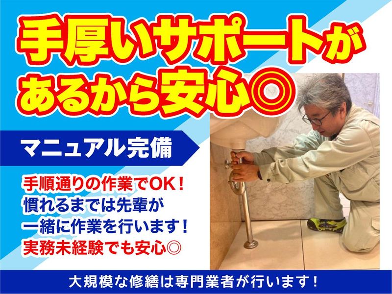 仕事内容 ──────────﹒☆﹒﹒── ⭐無資格歓迎!丁寧に教えます◎ ⭐資格取得で祝い金&手当毎月支給 ⭐DIYや機械いじりが好きな方に♪ ──﹒﹒☆﹒────────── 特別な資格は必要ありません! ホテルの客室や共用スペースにて 簡単な設備修理、調整作業をお任せ! 【具体的にはコチラ!】 ✅古くなった壁紙の貼り替え ✅切れた電球の交換 ✅エアコンのフィルター交換 ✅テレビ配線の調整 ✅客室電話の設置 ※大規模な修繕は専門業者に依頼します。 客室清掃チームとも連携を取りながら ホテル全体の環境整備をお願いします。 【 フォロー万全で安心スタート 】 ★マニュアル完備◎ 作業手順を詳しく説明している マニュアル動画の通りに 作業を進めればOKです! ★手厚いサポート体制を整備 慣れるまでは先輩スタッフと 一緒に作業を行います。 分からないことは その場で確認できるのでご安心ください! 【 資格取得でお祝い金支給! 】 ★祝い金&資格手当あり! 資格取得にかかった費用は 祝い金として全額支給します! 取得後は、毎月資格手当を支給◎ 無資格から手に職を付けられるチャンス! やればやるほど スキルアップができるお仕事です♪