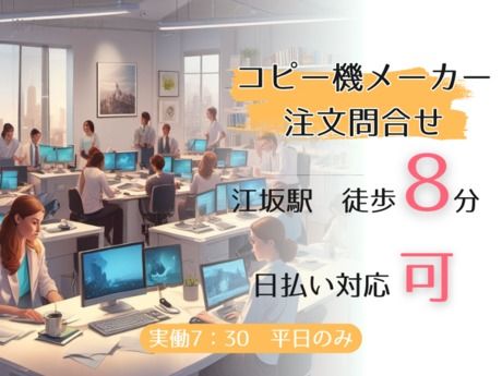 仕事内容 【OA機器サプライ(消耗品)受注業務】 複合機メーカー内での受注チームでのお仕事です。 企業や官公庁、病院、大学などのお客様から、トナーやホッチキスの芯といったOA機器消耗品の注文を受け付けます。 専用システムやFAX、電話での注文をもとに受注入力を行い、スムーズな商品手配をサポートします。 ▼主な業務内容 専用システム・FAX・電話からの受注入力 電話やメールでの問い合わせ対応※電話はインカムを利用します。 返品・キャンセル受付後、代替品の出荷処理 配送センターや営業所への問い合わせ対応(必要に応じて) コピー機を利用しているお客様からの注文対応 注文内容の詳細確認や品番・機種の特定 注文情報を専用システムに入力 ▼働きやすいシフト体制 研修後は電話受注からスタートし、その後FAX・WEB受注といった業務にシフトしながらチームで協力して業務を回していきます。 例えば、今日はFAX受注、明日は電話受注といったように、状況に応じて柔軟に対応します。 電話対応は主に法人のお客様となり、一般ユーザーからの問い合わせはありませんので、安心して業務に集中できます。 <その他> 随時入社 ※以降3カ月ごとの更新予定 ⌒*⌒*⌒*⌒*⌒*⌒*⌒*⌒*⌒*⌒*⌒*⌒*⌒ <服装> ・男性はスーツ ・女性はオフィスカジュアル <事業所体制> ・約30名 男性5名ほど ・残業は0~5h/月 ※ほぼ発生しません ・繁忙期:3.4月 連休明けも繁忙となる <施設内設備> ・休憩室/ロッカー 有 ・自転車置き場/食堂 無