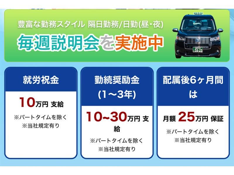 求めている人材 【必須条件】 ・普通自動車一種免許(AT限定可) ※未経験の方の場合は、普通自動車第一種免許取得後3年経過が必須 【こんな方におすすめ】 ・普通自動車二種免許をお持ちの方 ・学歴不問 ・未経験から活躍したい方 ・運転が好きな方 ・タクシー運転手やドライバーの経験がある方 ・フリーター、主婦(主夫)の方 ・ブランクのある方 ・地元に戻って働きたい方 ・2種免許取得者は経験不問(会社負担で資格取得が可能!) ・20~60代スタッフ活躍中!