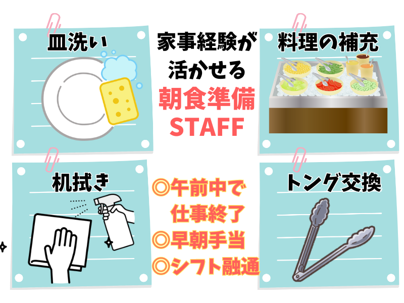 仕事内容 - \働きやすさのポイント!/ ✅週1日~勤務OK/選べる勤務時間 ✅平日のみ・土日のみOK ✅先輩スタッフのフォロー体制◎ ✅シンプル作業中心で未経験でも安心 ✅早朝手当あり ✅車通勤OK - 東横INN札幌すすきの交差点では、 朝食準備スタッフを募集中です。 1日4時間、週1日~勤務OK! 家庭やプライベートとの両立も可能です。 【業務内容】 ホテルのビュッフェ形式の朝食に関わる ・簡単な加温作業 ・料理や食器の補充 ・会場内の片付け、清掃 ・食材管理 などをお願いします。 ※お客様対応は挨拶程度でOK! ※会計業務はありません。 朝の時間を活用し、キレイなホテルという 落ち着いた環境で働きたい方におすすめです! - 【未経験スタート歓迎!】 - はじめは先輩スタッフがマンツーマンでサポート! 未経験でも、一つずつ丁寧に教えます。 「いきなり一人にされる」ことはありません! - 【車通勤OKで通勤ラクラク】 - 繁華街エリアでも、 早朝の車通勤なら混雑なし! ストレスの少ない移動で、 気持ちよく1日をスタートできます。 - 【まずは気軽に応募OK!】 - 履歴書は不要なので、 準備ゼロで応募できます。 面接も30分ほどでサクッと完了。 合否は最短“即日”、 遅くても1週間以内にお知らせします。 採用率90%の今がチャンス! 「ちょっとやってみようかな」も大歓迎です♪ 【応募方法】 ✨直接採用担当とお話ししたい方 →電話での応募大歓迎! 011-207-1045 までお気軽にお問い合わせください! ✨【応募】ボタンから応募の方 →エントリー後、担当者からご連絡差し上げます。 ご連絡が取れる 電話番号またはメールアドレスの 記載をお願いします。