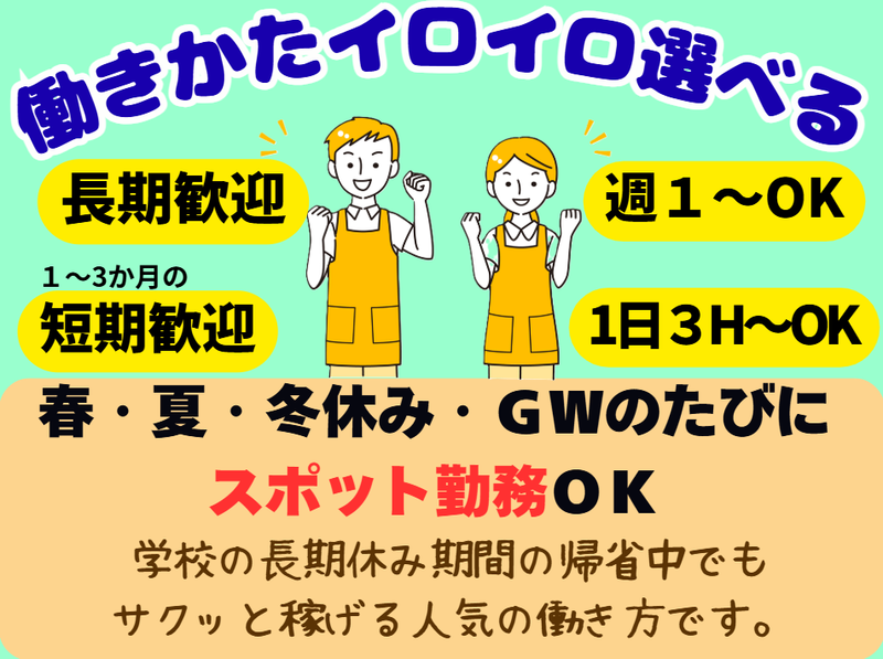 仕事内容 \いろんな働き方ができます/ 働きたくても 時間に制限が… 収入に制限が… 部活・サークルが… なんて方もまず注目下さい。 「学業応援シフト」 「Wワーク応援シフト」 「子育て応援シフト」 であなたの働き方をサポートします◎ ✅シフト自由 ・週1日~、1日3h~OK …学生&主婦(夫)歓迎! 高校生・大学生も多数活躍中! ・週末のみOK ・平日のみOK ✅1~3か月くらいの短期勤務も大歓迎! ✅春・夏・冬休み・GWなどの長期休みの たびにスポット(単発)バイトもOK! 帰省中にバイトしてしっかり稼いでる 学生さんもいます◎ ✅旅行や行事などで1度も入れない週が あってもシフト調整するから大丈夫ですよ◎ ✅週5日&フルタイムで働きたい方大歓迎 …正社員で働きたい!という方も お気軽にお問合せください♪ ✅お子様の春・夏・冬休みやGWなど 家において働きにいけない・・・ という方も安心下さい。 お子様の長期休み期間中は 一緒にお休みもOKです◎ ✅お子様の急な発熱等でのお休みも 臨機応変に対応します。 フードコートの店舗だから フロアやトイレ掃除なし! 配膳や机の片付けもなし! 休憩中にイオンモール内で お買い物ができちゃう◎ イオン従業員特典もあり!  ̄ ̄ ̄ ̄ ̄ ̄ ̄ お仕事内容 ――――――― *ホールといっても、フードコートだから 接客はカウンター内のみ♪ ・お会計(レジ) ・トッピングなどの簡単な調理補助 ・洗い場 シンプルな作業ばかりなので 未経験やバイトデビューの方も すぐに慣れていただけます◎ みんなで協力しながら メリハリつけて仕事したい! 同世代が多い職場で働きたい! そんな方にピッタリのお仕事です★  ̄ ̄ ̄ ̄ ̄ ̄ ̄ ̄ ̄ ̄ ̄ ̄ ̄ ̄ ̄ ̄ 商業施設内だから何かと便利! ―――――――――――――――― イオンモール今治新都市店には、アパレル ・雑貨店・飲食店・ATM・カフェなど 便利な施設がたくさんあります◎ 子ども向けの遊び場や イベントスペースもあるので シフトに入っていない日まで 遊びに来ちゃうことも♪ *** < スタッフインタビュー > *同年代が多くてバイトが楽しい♪ サークル気分で働けちゃう! *急なシフト変更も対応してくれるのが すごくありがたい! *有給も100%使えるから 推しのライブにも行けちゃう◎ *テスト期間もしっかり休めて 学業にもちゃんと取り組める! *マネージャーさんもとっても気さく♪ 何でも相談できちゃう! *お局さんみたいな人もいないから 気楽に働けてます(笑) 私たちと一緒にお店を盛りあげましょう★ ■イオンモール内で同時募集中■ 「石焼ビビンバ専門店アンニョン」 店舗はご希望優先でOK! ■正社員(店長候補)も同時募集■ 月給21万5000円~ 月8日休み、シフト制 年間休日105日 賞与年2回あり ※他同条件 気になった方は HPをご確認くださいね◎ https://ys-holdings.co.jp/omuraisutei/