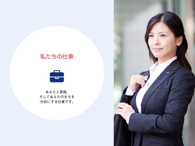 職場環境 < 先輩インタビュー > 地域の企業様に貢献できる 仕事であり、自分自身も 成長できると思い入社しました。 実際、商工会議所の会員事業所という 訪問先が付与されるので、 非常に仕事がしやすい環境です。 金融に関する知識も付き、 自分の成長も実感しています。
