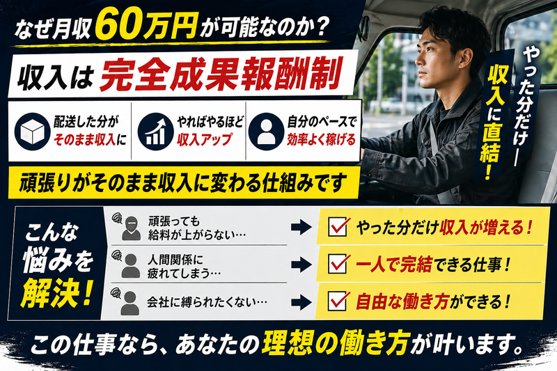 仕事内容 \\\ 年収アップを目指せる環境 /// 「頑張っても給料が上がらない」 そんな働き方から抜け出したい方へ。 この仕事は、 やった分だけ収入に直結する配送パートナーです。 ■ この仕事の特徴 ◇ 直行直帰OK ◇ 週払い対応OK 無駄な時間を削り、 収入に集中できる環境です。 ■ 稼ぎやすい理由 ◇ 配送件数が安定している環境 ◇ 住宅地中心で回りやすい構成 ◇ 長距離移動が少なく効率よく稼働できる テンポよく回れるため、 行動量をそのまま収入に変えやすい仕事です。 ■ 高収入を目指せる仕組み ◇ 配送件数に応じて報酬が決定 ◇ 稼働量がそのまま収入に反映 ◇ 効率よく回るほど収入アップ 固定給ではなく、 自分の動きで収入を伸ばせる仕組みです。 ⏩️ 業務内容 ネット通販の商品(小型家電・日用品・雑貨など)を配送 ■ 仕事の特徴 ◇ 置き配が中心 ◇ 再配達の負担が少ない ◇ 対面ストレスが少ない ◇ 一人で完結できる業務 人間関係に左右されず、 自分のペースで稼働できます。 ⏩️ 稼働の流れ 自宅から倉庫へ直行 ⭕ ↓ 荷物を積み込み ↓ 担当エリアを配送 ↓ 完了後はそのまま帰宅 ⭕ 出社のための往復なし 時間を効率的に使えます ■ 報酬について 報酬は稼働量により決定 ◇ 継続して稼働すれば月収60万円も可能 ◇ 週払い対応あり ■ この仕事に向いている方 ◇ 頑張りを収入で実感したい ◇ 固定給では満足できない ◇ 人間関係に疲れている ◇ 一人で集中して働きたい ✨ この仕事のスタンス これは「雇われる働き方」ではなく、 自分の行動で収入を作る働き方です。