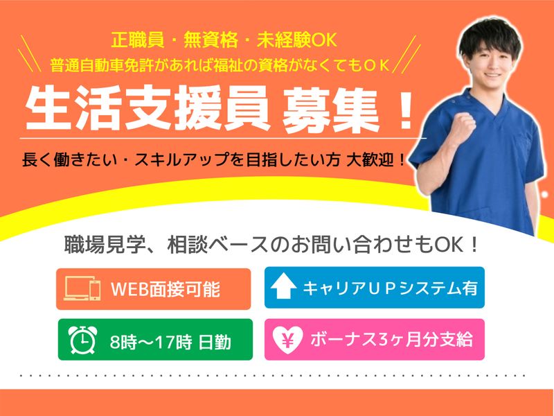 仕事内容 <仕事内容> みやま市にある障がい者支援施設にて、利用者様(約60名)の「当たり前の日常」を支える生活支援員をお任せします。 チームで連携する場面が多く、あなたのバイタリティが活かせる職場です。 【具体的な業務】 日常生活のサポート(食事・歩行の見守りや介助) 日中活動の支援(タオル畳み、部品組立などの軽作業サポート) 外出・レクリエーションの企画・引率 利用者様の送迎(ミニバン使用) 支援記録の作成(PC入力) ※「介護=静かなケア」だけではありません。一緒に作業をしたり、外へ出かけたりと、アクティブに関わることが大切です。 ※チーム制で動くため、困ったときはすぐに相談できます。 <おすすめポイント> 1. 【給与待遇】 「賞与年3ヶ月分」の支給実績あり!安定した収入で、将来の生活設計も安心です (設立23年の安定基盤。頑張りが給与に直結するため、家族を持つスタッフも多数活躍しています) 2. 【人間関係】 スポーツ・製造・営業…異業種出身の男性スタッフが中心となり活気ある職場です (「福祉は初めて」という先輩ばかり。飾らない雰囲気で、新人さんもすぐに輪に入れます) 3. 【働きやすさ】 「体を動かす仕事が好き」なら天職。デスクワークにはない充実感があります (利用者様と一緒に作業や運動を行います。じっとしているのが苦手な方にピッタリの環境です) 4. 【キャリア】 無資格から「国家資格」を目指せる。一生廃れない専門スキルを働きながら習得 (資格取得支援や勉強会が充実。未経験からスタートし、リーダー職へステップアップも可能です) 5. 【やりがい】 「〇〇さんがいると助かるよ」。あなたの存在が、利用者様の「できる」を増やします (できないことを補うだけでなく、利用者様の強みを伸ばす「攻めの支援」ができる面白さがあります) 求める人材 【必須】 チームワークを大切にし、誠実な対応ができる方(普通免許AT限定可) 【歓迎】体を動かすことが好きな方、スポーツ経験がある方 【歓迎】製造、物流、販売、営業など異業種からのキャリアチェンジ 【マインド】「人の役に立ちたい」「安定した環境で長く働きたい」という意欲のある方 【資格】無資格・未経験OK!初任者研修・介護福祉士等の資格者は手当等で優遇します <職場・企業紹介> 設立から23年、福岡県みやま市にて地域に根差した障がい者支援を行っています。当法人の特徴は「チーム力」。20代~50代の幅広い世代のスタッフが在籍していますが、職種の垣根を越えて協力し合う風土があります。特に男性スタッフが多く活躍しており、現場はいつも活気に満ちています。「福祉の仕事は未経験」という方も、マンツーマンで丁寧に教えますのでご安心ください。 最後までお読みいただき、ありがとうございます。 「福祉の資格がないから…」と諦める必要はありません。今のスタッフも、ほとんどが未経験からのスタートでした。 必要なのは、利用者様と同じ目線で楽しむ心と、チームを大切にする気持ちだけです。まずは見学だけでも大歓迎です。 活気ある私たちの職場で、新しいキャリアをスタートさせませんか?ご応募を心よりお待ちしています。