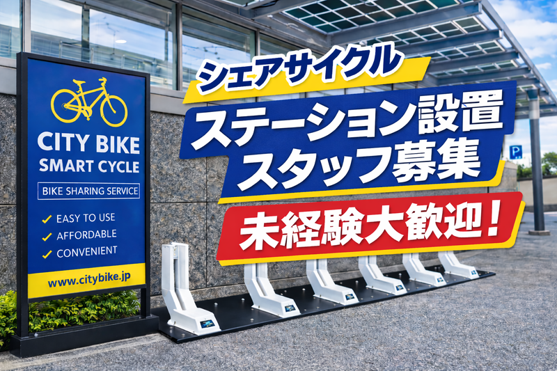 仕事内容 未経験でも安心! 倉庫内でのシェアサイクル(電動アシスト自転車)の入出庫・組立作業と、ステーション設置作業のお仕事です。 作業はシンプルで、未経験の方でもすぐに覚えられます。 【主な作業内容】 ① 自転車の受け入れ ② 開梱作業 ③ サークル錠・車体番号の確認入力 ④ 付属品の取付・調整 ⑤ 出荷のための整列作業 ⑥ ステーション(駐輪場)部材の車への積み込み ⑦ シェアサイクルステーション(駐輪場)の設置作業 ※ステーション(駐輪場)設置は指示された場所まで車で移動し、現地で組立・設置を行います。