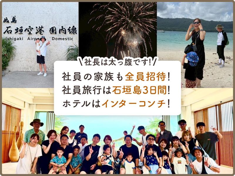 職場環境 困ったことがあれば、誰かが「大丈夫?」と声をかけてくれる。そんなあたたかい社風です。人にも、会社にも、ひとめぼれして入社する人が多いのも、納得してくれるはず。今年の社員旅行は一緒に行きましょう。韓国か、宮古島か、石垣島か・・・ 喫煙所:喫煙所あり(屋外)