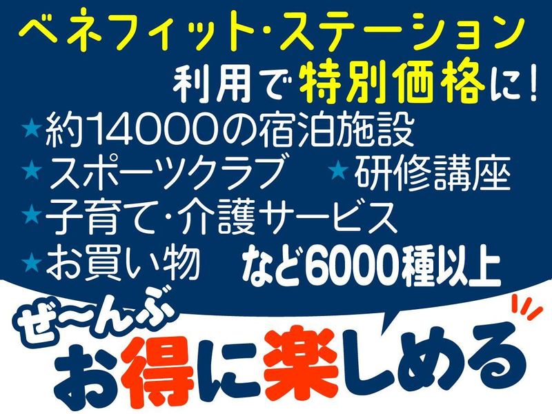 【保険制度】 雇用保険、労災保険、健康保険、厚生年金 待遇・福利厚生 【福利厚生】 ■交通費支給(月上限5万円) ■有給休暇(入社6ヶ月後) ■社会保険完備 ■制服貸与 ■稼働手当有 ■昇給年1回 ■寸志年2回 ■お年玉あり ■各種手当あり ■研修制度あり ■マイカー通勤OK ■国内・海外・各ホテル社員割引制度 ■従業員割引/ベネフィット・ステーション →弊社と提携している会員制で、 お得な待遇が受けられるサービス。 約14000施設の宿泊施設に 会員価格でお得に利用ができたり、 その他にも・・・ ✅スポーツクラブ ✅介護・育児 ✅健康管理 ✅研修講座 ✅エンターテイメント ✅物販 etc 6000以上の様々なライフサービスを 揃えています。 これらすべてのメニューを 会員特別価格で 利用することができるサービスです♪