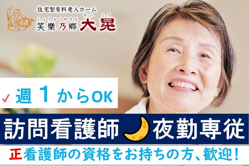 【仕事内容】 訪問看護ステーション「看護」スタッフ募集!(夜勤専従) 2名体制の夜勤です。 週1日からOK!たくさん働きたいのご希望も大歓迎です!WワークもOK!介護施設未経験の方も歓迎です! 【PRポイント】 ・心からの感謝の言葉を貰えるお仕事です ・一人ひとりと向き合う寄り添った介護が可能 ・スタッフ間のチームワークと雰囲気の良さ! ・チームで支え合い、成長できる環境! ・夜勤も手当充実!働き方に合わせた柔軟な勤務制度! ■具体的な仕事内容 併設するナーシングホームでの訪問看護のお仕事です。 ・看護業務 ・利用者様の巡回と安否確認 ・介護看護記録 ・起床時の介助やお手洗い誘導 など ■笑樂乃郷 訪問看護ステーション(しょうらくのさと) のびのびとできる自然に囲まれた全32床の平家建てナーシングホーム笑樂乃郷 大晃 併設の訪問看護ステーション。 「もっとやさしく、もっとたのしく、未来へつなぐ」を大切に、ご入居者様はもちろん、 会いに来てくださるご家族のみなさまもゆったりと過ごしていただける施設です。 自立した生活を行っていただくために、利用者様を尊重したサポートを実施しています。 ■実務未経験の方も歓迎です 先輩スタッフが、一から丁寧にサポートします。ブランクのある方も、もちろん安心して働けます。 ■お気軽にお問い合わせください。 ぜひご応募くださいね。 いきなりの面接は不安な方には施設見学も大歓迎です。 働き方の相談や、仕事内容のご質問などのお問合せもお気軽にご連絡ください。 入職時期が2、3ヶ月後の方も遠慮なく、施設見学承っています。先ずはメールでお問い合わせ下さい。