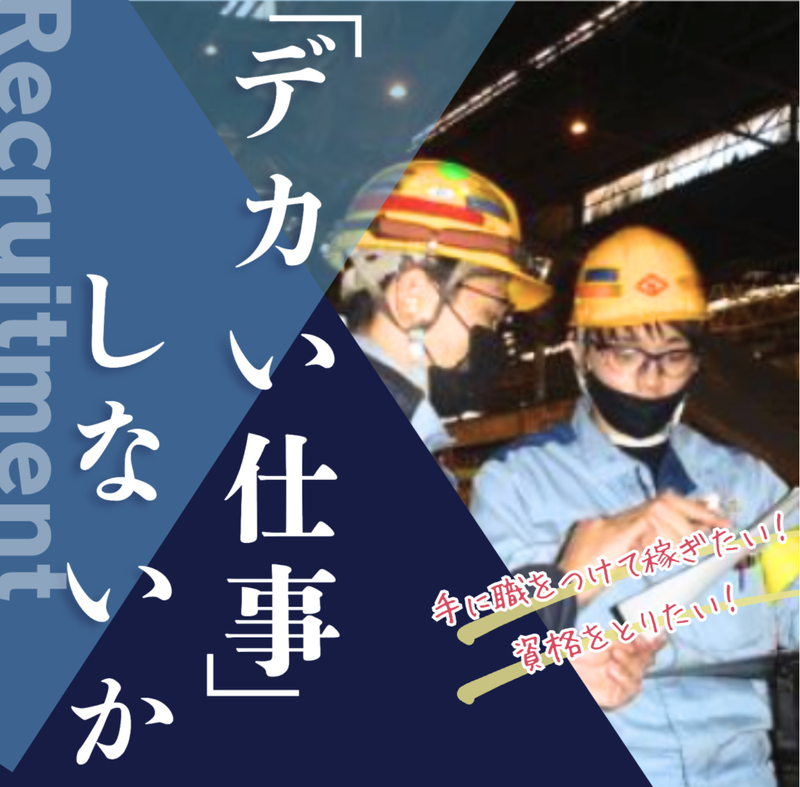 仕事内容 ━━━━━━━━━━━━ 巨大な鉄製品を、 あなたの指先一つで運ぶ。 ━━━━━━━━━━━━ 「テレコン」を使った クレーン操作をお任せします。 とにかく「デカい」! 数十トンもある鉄製品を扱います。 橋、ビル、船などに使われる スケールの大きな製品。 そんな製品を、指先の感覚で操作する… 自分の成長を実感できる面白さと、 日本のインフラを支えているという自負が 仕事の大きなやりがいです。 ╭━━━━━━━╮ この仕事の魅力3選 ╰━v━━━━━╯ ✅圧倒的なスケール感! 数十トンの鉄製品を 手元の十字レバーやスイッチで操作する… ダイナミックな仕事です! ✅社会インフラを支える! 橋やビルに使われる製品。 地図に残る仕事に関われます! ✅確かな技術と高収入! 未経験1年目で年収500万円可! 資格取得にかかる費用は全額当社負担! 一生モノの技術が、 働きながら身につきます♪ - ╭━━━━╮ 仕事の特徴 ╰━v━━╯ <実は、力仕事ではありません> 扱うのは巨大な鉄製品ですが、 持ち上げるのは「クレーン」です。 あなたの指先ひとつで、 何十トンもの鉄が動きます。 まるで巨大なラジコンや UFOキャッチャーのような感覚。 車の運転に感覚は近く、 コツを掴めば、面白いように 思い通りに動かせるようになります♪ - ◆具体的な作業イメージ - 運転席には座りません。 ゲームのコントローラーのような 「テレコン」を肩から下げて、 歩きながら遠隔操作します。 地上で製品の近くにいけるから、 細かい位置調整も目視でバッチリ! - ◆未経験でも大丈夫な理由 - 「難しそう…」と思いましたか? 大丈夫、みんな最初は未経験です。 実はこの仕事、 一人前になるのに「半年」かかります。 逆に言えば、 【半年間はできなくて当たり前】 だと思っています。 だから、焦らせることはありません。 「見て覚えろ」なんて言いません。 ・製品が揺れないように止めるコツ ・安全な積み方のルール これらを、ご本人の適正を鑑み 任命した先輩社員が じっくり教えます。 安心してください! - ◆資格は入社後にGET! - 必要な資格は、入社後に 会社の全額負担で取得できます。 最初の1週間は座学で、 安全の知識を学ぶところから。 いきなり現場に放り込むような ことはないのでご安心ください。 AIにはできない、 一生モノの「職人技」を ゆっくり身につけましょう♪