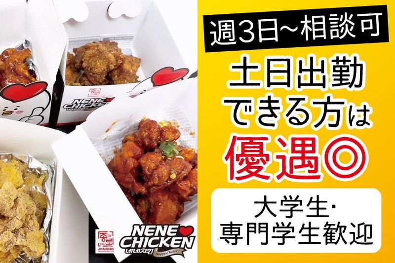 仕事内容 …… "韓国好き"は見逃せない!? …… テイクアウト専門店 「 NENE CHICKEN 」で働こう♪ 【 仕事内容 】 *専用端末を使用したPOSレジでの会計 *調理補助 など。 どちらもとってもカンタン♪ 先輩が横でしっかりサポートします◎ 「包丁を握ったことがない」 という未経験者さんでも大丈夫! 【 和気あいあいとした働きやすい職場 】 20代女性スタッフが中心に活躍中! みんな韓国好きなスタッフばかり♪ 3ヶ月に1度、スタッフ全員で 韓国料理を食べに行くこともあるほど! 休憩時間や落ち着いたときは 韓国アイドルの話で盛り上がることも◎
