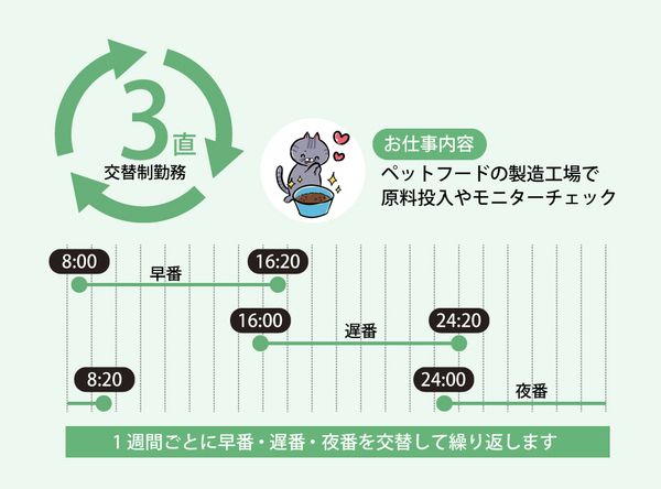 勤務時間 固定時間制 【三交替】 8:00~16:20 16:00~0:20 0:00~8:20 ※休憩有 【勤務期間】 長期(3ヶ月以上) 即日~ ※残業は少なめだからプライベートが充実しますよ♪