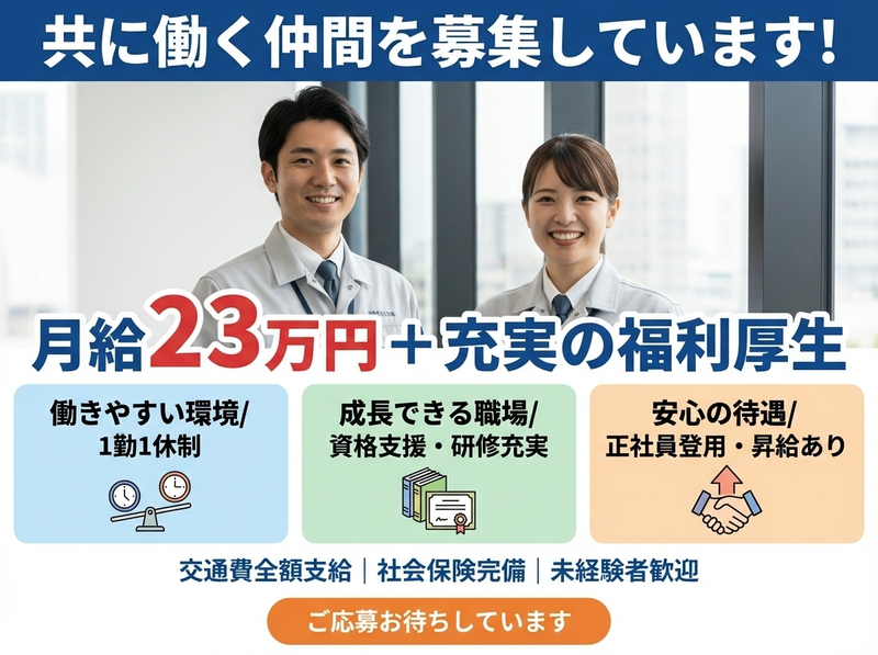 仕事内容 公共文化施設「久留米シティプラザ」内での設備管理業務をお任せします。 ⏩空調設備管理 ⏩電気設備・機械設備の点検/管理 ⏩漏水・照明切れなどの不具合対応 ⏩施設内巡回・日常点検 施設の“当たり前の安心”を守るお仕事です。 設備管理経験者はもちろん、未経験からのスタートも歓迎✨ OJT研修でしっかりサポートします✅ ⭐責任者候補も同時募集 ⏩月給24万円+資格手当 ⏩下記資格保有者優遇 ・電験三種(第三種電気主任技術者) ・建築物環境衛生管理技術者 ・危険物乙4類 設備管理の実務経験を活かし、 現場の中核として活躍いただけるポジションです。 公共施設という安定した環境で、 責任ある立場としてキャリアアップを目指したい方歓迎❗ 将来的に現場管理を担っていただけるポジションです。 経験を活かしてステップアップしたい方歓迎❗ ❗この仕事の魅力 ⭐月給23万円+資格手当で安定収入 ⭐1勤1休で無理のない勤務体系 ⭐交通費全額支給 ⭐正社員登用制度あり(過去3年で5名実績) ⭐資格取得支援制度あり 「安定した環境で腰を据えて働きたい」 そんな方に最適な職場です。