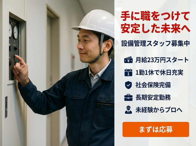 求めている人材 ✅設備管理・ビルメンテナンス経験者歓迎 ✅電験三種・電気工事士・ボイラー技士など資格保有者優遇 ✅未経験でも機械・電気・設備に興味がある方歓迎 ⭐こんな方に向いています ⏩設備の仕組みを考えるのが好きな方 ⏩トラブル発生時に冷静に対応できる方 ⏩コツコツ点検・巡回業務が苦にならない方 ⏩決められたルールを守って丁寧に作業できる方 ⏩報告・連絡・相談がきちんとできる方 ⭐こんな志向の方も歓迎 ⏩公共施設で安定勤務をしたい方 ⏩1勤1休で体に無理なく働きたい方 ⏩将来は責任者ポジションを目指したい方 ⏩電験三種を活かせる現場を探している方 ⏩資格取得を目指してスキルアップしたい方 ⭐活かせる経験(あれば尚可) ・商業施設や公共施設での常駐設備管理 ・ビル巡回点検業務 ・設備修繕対応 ・防災センター業務 ・警備や施設運営サポート経験