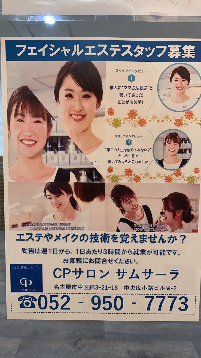 仕事内容 ――――《 仕事のポイント 》―――― ⏩エステサロンスタッフを募集します ⏩未経験OK!エステデビュー大歓迎 ⏩働きながら、キレイになれちゃう♪ ⏩2024年4月オープンのキレイなお店 ⏩「新栄町駅」から徒歩5分/駅近です ⏩副業・Wワーク・トリプルワークOK ⏩週1日~・1日3時間~勤務相談OK ⏩家事や子育てとの両立◎扶養内OK ⏩主婦パートさんが多数活躍中◎ ⏩昇給あり/時給+インセンティブあり ⏩社割あり/お得に化粧品を購入可◎ ―――――――――――――――――― 名古屋市中区栄エリアにある フェイシャルエステ専門のサロン 「CPサロン サムサーラ」です CPコスメティクスの化粧品を使った スキンケアサービスを提供しています。 今回、私達と一緒に働いてくれる 「エステサロンスタッフ」を募集! お客様のキレイをお手伝いするお仕事で 楽しく働きませんか? ―――――――――――――― 仕事内容について ―――――――――――――― ⏩どんな業務があるのか? ・・・・・・・・・・・・・・・・・・・・・・・・・・・・・ お客様のキレイの お手伝いをお願いします ◆カウンセリング お客様の肌をチェックし、 一人ひとりに合った化粧品をお選びします。 ◆フェイシャルエステティック お客様のキレイを高める 本格的なお手入れで、 肌も心もリフレッシュして頂きます。 ◆メイクアップアドバイス お客様のご要望をお聞きし、 一人ひとりの魅力を引き出す メイクアップ方法をアドバイス。 ◆化粧品販売 お客様のお肌に合ったスキンケアや メイクアップの商品をご提案頂きます。 ⏩美容の知識がなくても大丈夫? ・・・・・・・・・・・・・・・・・・・・・・・・・・・・・ 年齢・経験は一切不問! 美容やエステの 知識がなくても大丈夫ですよ マニュアルと研修があるので、 安心してスタートできます◎ 働きながら自分の「キレイ」も 磨けるのが、この仕事の魅力です 隙間バイトから、 将来お店を持ちたい方まで 幅広く歓迎します! ⏩働きながらキレイになれるって本当? ・・・・・・・・・・・・・・・・・・・・・・・・・・・・・・・・ ベテランながら年齢不詳(笑)の スタッフさんも多く・・・ 美と若さを保ちながら、 イキイキお仕事できることをお約束します! さらに、スタッフはお得に化粧品を 購入できるのも嬉しいポイントです。 トレンドメイクなども覚えられますよ♪ ⏩CPコスメティクスとは? ・・・・・・・・・・・・・・・・・・・・・・・・・・・・・・・・ 日本の化粧品メーカーで、 肌本来の美しさを引き出すことを コンセプトにしています サロン専用のスキンケアや メイクアップ製品を展開し、 化粧水や乳液、美容液など 高品質なアイテムを提供しています。 ⏩CPサロンとは? ・・・・・・・・・・・・・・・・・・・・・・・・・・・・・・・・ CPコスメティクス製品を使った フェイシャルエステ専門サロンです 全国に約1240店舗を展開中! エステ+化粧品販売を中心に 美肌カウンセリングや メイクアドバイスを提供します 未経験から開業できる サポート体制も充実しています。 お店の雰囲気なども 伝わるかと思いますので ぜひインスタグラムもご覧ください! ⏩@cpsalon__samsara ⏩どんな方が働いているの? ・・・・・・・・・・・・・・・・・・・・・・・・・・・・・・・・ 主婦パートさんも多数活躍中! 家事や子育てと両立しています 育休・産休明けの方も たくさんいらっしゃいます。 2004年4月にオープンした 老舗サロンなので、 長く勤めてくれている スタッフも多いです! ⏩どんな働き方&キャリアがあるの? ・・・・・・・・・・・・・・・・・・・・・・・・・・・・・・・・ 空いた時間に働けるので、 隙間時間を有効活用できます。 かけもち・トリプルワークもOK! ライフスタイルに合わせて 柔軟に働けますよ さらに、 店長やサロンオーナーへの キャリアアップも可能! 美容の知識を身につけながら、 スキルアップできます