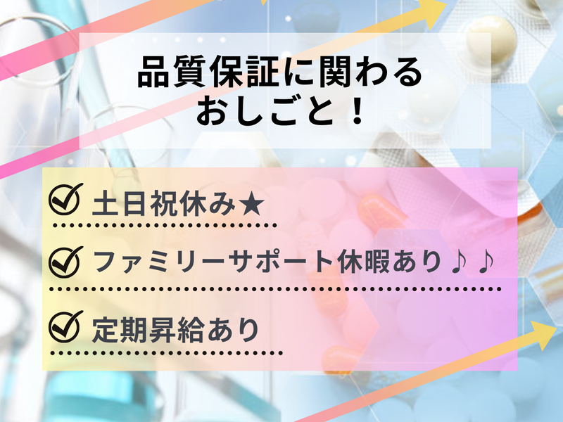 仕事内容 ◎大手上場グループ会社で安定勤務 ◎充実した休暇制度&福利厚生 ◎研修制度・資格取得支援あり ◎未経験から専門性を磨けます! - お薬などの医薬品の品質保証を管理する 部門での事務スタッフの募集です。 事務スキルがあればOK! 専門知識はなくても大丈夫です。 入社後、丁寧に教育をしますので 安心してご応募ください。 品質試験のデータのチェック作業 などを行います。 PCでの書類やデータ作成業務、 文書保管・管理などもお願いいたします。 法令や決められた社内ルールに基づき 業務を行います。 慣れるまでは、先輩や社員の方が きちんとサポートしますので、 心配ありません♪