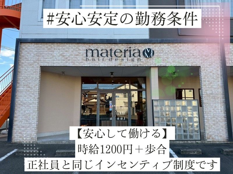アピールポイント: ★人間関係の良さは地域TOPクラス★ 現在ママさんSTAFFが4名在籍しており、 なんとその内3名が産休に入る予定。 「お互い様」の精神が根付いている温かい職場です。 皆さんが皆さんに合ったペースで お仕事していただけるよう 環境を整えていってます♪ ★materiaで働くSTAFFの声★ ▼30代・ママスタイリスト 以前は子供が熱を出す度、 現場に気を使ってましたがmateriaでは 『気にせんと休んで』と背中を押してもらえます♪ 自分のペースで働けるので、 子どもと過ごす時間も増えました♪ 家族との時間も大切にできるから、 仕事も頑張れます♪ ・・ー・・+・・ー・・+・・ー・・
