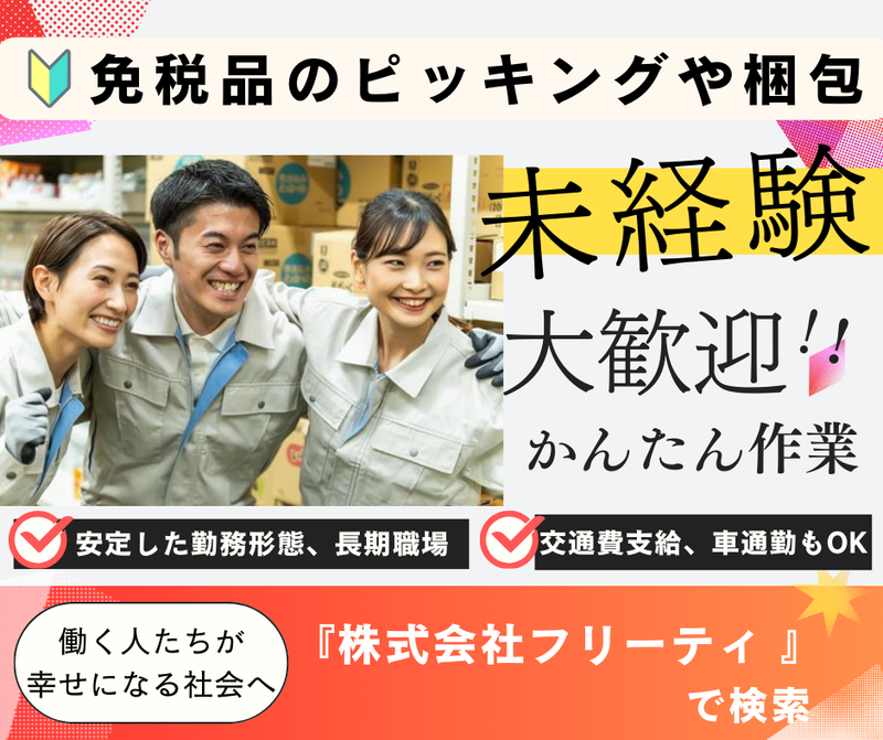 仕事内容 関西空港内でのお仕事✨ 倉庫内で免税品のピッキングや検品、梱包などの軽作業をお任せします! 扱う商品は、お酒・たばこ・化粧品・お菓子などです。 20〜60代と幅広いスタッフが活躍中! 未経験からスタートした方ばかりですが、シンプル軽作業のみなのですぐに作業も覚えていただけます♪