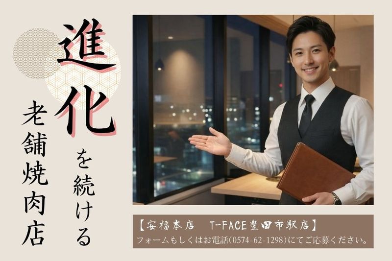 【仕事内容】 精肉店をルーツに持つ焼肉店「安福」は、素材の品質と、現場を大切にする姿勢を軸に店舗運営を行ってきました。 某グルメサイトの焼肉ランキングにも選ばれるなど、味だけでなく、お店づくりそのものが評価されています。 来春には、豊田エリアで新店舗オープンを予定。 今回は、現場を理解している経験者の視点で、複数店舗を支えてくださる方をお迎えしたいと考えています。 \ココで働くおすすめポイント/ ■豊田市駅から徒歩1分の好立地 ■月給45万円+賞与の好待遇 ■完全週休2日制で、仕事と私生活の両立が可能 ■現場経験を重ねてきた30代~40代が中心になって活躍中 「現場に入りっぱなし」ではなく、必要に応じて現場にも入りながら、人と店舗を整える役割に専念できる環境です。 【具体的な仕事内容】 ■各店舗の売上・予算管理 ■スタッフの採用・育成・指導 ■店舗間の連携・サポート体制の強化 ■マーケティング戦略の立案・実施 ■顧客満足度向上に向けた取り組み ■本社と現場をつなぐ橋渡し役 など 数字だけでなく、「人」や「お店の雰囲気」も大切にしながら、エリア全体を見守っていただくポジションです。 \基本的なキッチン業務もお任せします/ □仕込み(肉のカット・下準備) □調理、盛り付け □食材の在庫チェック □厨房の清掃・洗い場 ================= ✅地域と人を大切にできる方が活躍できる職場 ================= 私たちが何より重視しているのは、店舗やスタッフ、そして地域のお客様から信頼される人柄です。 「数字だけでなく、人の気持ちも大切にしたい」 「約束やルールを守り、誠実に向き合える」 そんな方にこそ、お任せしたいポジションです。 =============== ✅働きやすさと評価、どちらも大切に =============== 月給45万円を入社1年目から実現。 さらに、【年数回の美味しいお肉のプレゼント】など、安福ならではの嬉しい福利厚生もご用意しています✨ ============= ✅豊田という町で働くという選択 ============= 派手さはないけれど、生活基盤が整い、家族との時間も大切にできる豊田の町。 その中で、30代・40代として培ってきた経験を活かしながら、安定して長く働ける場所を探している方に、ぜひ知っていただきたい職場です。 【求人ID-UMD】