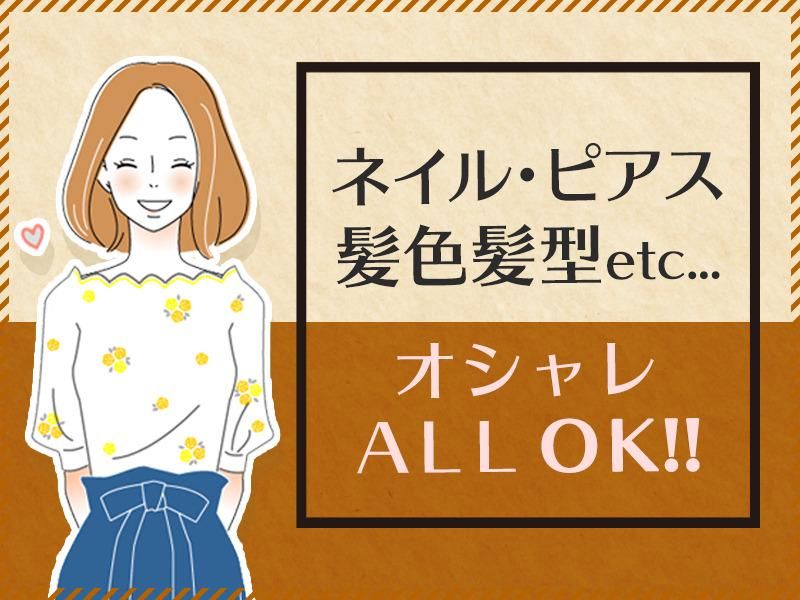 【保険制度】 雇用保険、労災保険、健康保険、厚生年金 待遇・福利厚生 【福利厚生】 ◆昇給あり ◆履歴書不要 ◆交通費全額支給 ◆社会保険完備 ◆社員登用あり ◆有給取得制度あり ◆髪型・髪色自由 ◆ネイル・ピアスOK ◆駅から徒歩スグ ◆ウォーターサーバー完備