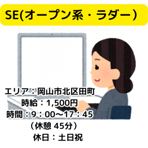 インフォメーション 接客販売から初めての転職の方へ【スキルも学歴も経験も不要】土日休みでしっかり休める。接客販売で培った経験を活かして「プライベートを大事に出来る仕事」を始めませんか? 【ビデオ通話での簡単登録始めました】 「must be (マストビー)だからこそ」 お仕事のご紹介特典いろいろ ・子育て主婦(夫)さんや自営業や シフトワーク、 Wワーク希望の方にもマッチした 勤務形態をご紹介。 ・フルタイム、パートタイム、時短勤務など のいろんな働き方の方々を応援! ・日払い、週払いOK!急な出費にも安心の お給与体制があります。(規定あり) ・来社は不要!出張登録OK! あなたのお住まいのお近くのカフェや 喫茶店で登録手続きができます♪ ・学歴不問、あなたのやる気を応援、 お仕事紹介でサポートいたします! ・学生さん、主婦(夫)さんから、 バリバリ稼ぎたい方、 まだまだ働き盛りの50代の方まで、 幅広い年齢層の方々が絶賛活躍中! アピールポイント ビデオ通話での簡単登録可能 must be(マストビー)では多種多様な職種を 取り揃えています。 どんな仕事を探しているかお気軽に お問合せ下さい! 1月は採用強化中! 1月中に応募いただいて 「1月中のスピード入社」はもちろん, 2月以降入社も随時相談承ります!