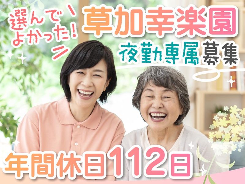 仕事内容 ≪夜勤専従の募集です!≫ ご利用者様の生活サポート全般をご担当いただきます。 例えば・・・ ・夕飯の介助:夕食や飲み物の配膳 ・起床介助:ご利者様の着替えのサポート ・就寝時の見回り業務 通勤も駅チカでラクラクです♪ 草加や越谷など近くから通っているスタッフが多いですよ。 地元で働きたい方大歓迎です! ★☆社会貢献度の高い職業です☆★ 介護業界未経験、業界の別職種からの転職スタッフも活躍しています。 現在、草加幸楽園の在籍スタッフは53名。 平均勤続年数5.3ヵ月!その中の約80%がなんと業界未経験からのスタートなんです!! 最初は先輩スタッフがついて業務を教えてくれるから安心してください◎ また、月に1度の『研修会』や『資格取得制度』もあり、未経験からでもしっかりサポートします!! 【“完全未経験者大歓迎"】 資格を取得し手に職をつけて働きたい、ホスピタリティのある仕事をしたい、両親の介護で得た経験を活かしたい!等、 理由は様々ですが「完全未経験」で入社したスタッフばかり!だからこそ、教育体制も完備しています◎ 先輩スタッフが多いからこそわからない事があっても聞きやすい環境です。 ◆医療法人運営の介護付老人ホーム◆ 「選んでよかった!草加幸楽園」を施設目標に掲げ、入居者、ご家族が安心できる施設を職員一同目指しています! 当園はチームケアを大事にしているので、困ったときは職種関係なくみんなで協力しています。 わからないことは何でも聞ける!そこが草加幸楽園の魅力です◎
