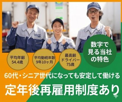 仕事内容 【この求人のPoint】 ・エリア限定求人 ・60歳定年後の再雇用あり(給与下がりません) ・昭和50年創業で安定の経営基盤 ・地元で働きたい、地元に貢献したい方にピッタリ ・トラック未経験の方も大歓迎です ・固定ルート配送でシフトも決まっていて安定 【詳しい仕事内容】 ・4tトラックで大手メーカーの食品を配送 ・近隣センター配送 ・配送先は固定!ルートを覚えれば簡単です ・つらい作業はありません 地域にパンを配送する、 地元密着の物流サービスです。 自分の配送した商品が地元の店頭に並ぶので、 地元に貢献し、街の暮らしを支える、 やりがいのあるお仕事です。 固定のルート配送ため、 一度道を覚えれば安心です。 勤務時間やシフトも決まっているため、 安定して自分のペースで働けます。 体の負担が少なく、 長く続けられるのが特徴です。 【60代以上でも給与は下がりません】 60歳定年後の再雇用制度もあるので、 シニア世代になっても、 安定した生活基盤を維持できます。 堅実な生活設計が可能な安定した職場です。 【社員向けの寮・社宅を完備!】 <入社から半年間は寮費無料!> <半年後~1年目終了までは寮費半額!> 引越しと同時にお仕事を探さしている方にもピッタリ! 勤務地からスグに社員向けの寮を完備しています。 ご希望の方にはご案内しますので、 ご応募の際に「寮希望」とお伝え下さい。 【昭和50年創業で安定の経営基盤!トラック未経験も大歓迎です!】 従業員400名以上、大手顧客を対象に規模を拡大。 成長を続ける当社は、仕事の安定はもちろん、 待遇の改善にいち早く取り組み、 評価されてきました。 研修は「焦らず・じっくり」行うことが評判です。 トップクラスの優しい研修で未経験からプロに! もちろん経験者の方も歓迎です! 最初は先輩に同乗し、 現場の研修や運転の研修をします。 勤続10年以上のスタッフも多数おりますので、 安心して勤務をはじめることができます。 定年後も継続雇用で活躍できます。 車両はドライブレコーダー、バックモニター完備。 安心して運転できる環境を整えています。