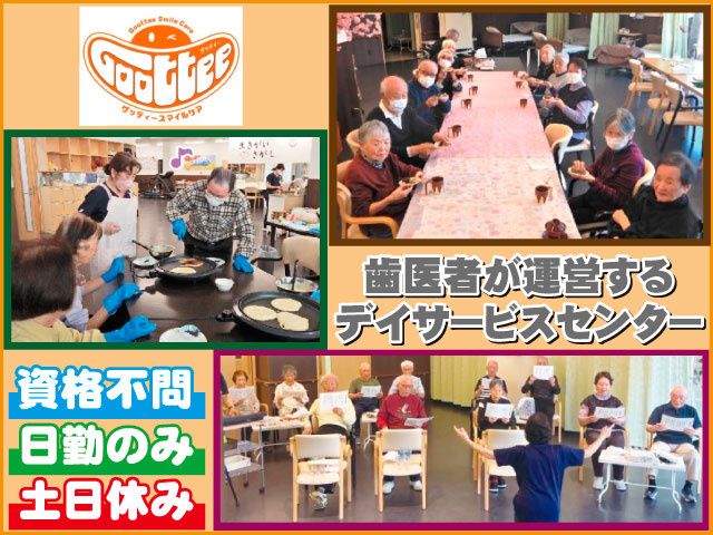 仕事内容 歯科医師が運営するユニークな介護施設 ご利用者様の「食べる力」に着目し、 口腔ケアを重視することで 「最後まで自分の口で食べる喜び」をサポートしています。 新規ご利用者様の増加に伴い、機能訓練指導員(パート)を急募! ブランクがある方もOKです! 介護施設未経験歓迎 新規ご利用者様増加につき デイサービスセンターでパート職員として機能訓練指導員を急募。 ブランクのある方も働きやすい 職場環境なのでお気軽にご応募を下さい. 「働きやすさのPOINT」 ・週3日~OK ・土日休み+夏季・年末年始休暇あり ・熊谷駅から徒歩3分!アクセス抜群 ・残業ほぼなし 「主な業務内容は」 〇個別機能訓練計画書の作成 〇歩行訓練・立ち上がり訓練・関節可動域訓練 〇筋力低下・転倒予防のための体操指導 〇日常生活動作(立つ・座る・歩く等)の維持・向上支援 〇訓練内容の記録・報告書作成 熊谷駅近くですので通勤は便利な職場です。 熊谷駅より徒歩3分!電車通勤もララク 行田市、深谷市、本庄市からもアクセス良好 駐車場も完備しておりますので車通勤も可能。 お電話でのお問合せもお気軽にどうぞ 048-501-7110(採用担当まで) 弊社のホームページもご覧ください https://goottee-sc.com/ 弊社採用サイト https://entori.jp/goottee-sc 日頃の様子を載せていますのでぜひご覧下さい グッティースマイルケア Instagram https://www.instagram.com/gootteesmilecare/