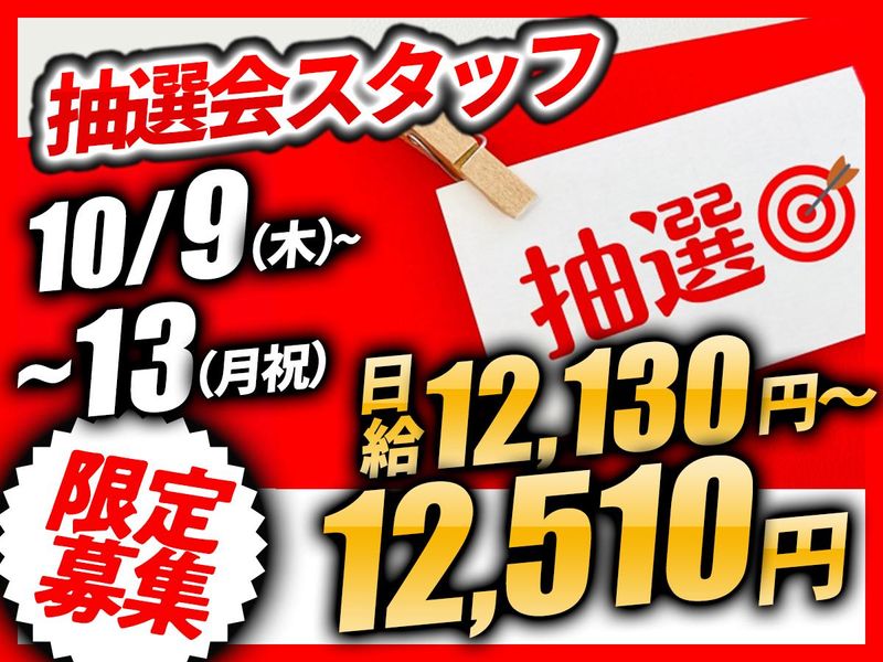 仕事内容 ✦・━・✦・━・✦・━・✦・━・✦・━・✦・━・✦ 駅前商業施設での 抽選会スタッフ募集︕ ✦・━・✦・━・✦・━・✦・━・✦・━・✦・━・✦ \10/9(木)~10/13(月祝)限定!/ ◇高日給 ◇1日のみの勤務OK ◇週払いOK、日払いも相談可! ◇短期のレア求人 ◇友達同士の応募もOK ◇新しい友達が出来るかも!? ◇駅チカ ◇資格、経験、学歴不問 ◇簡単業務で働きやすい ◇副業、WワークもOK ✧・━・✧・━・✧・━・✧・━・✧・━・✧・━・✧ ▽お仕事内容 ✅抽選会業務 ・iPadを使用したデジタル抽選業務など 《★学生限定で日払い可(規定有)》 >>> 学生さん限定で日払いOK!(規定有) 登録会での申請と学生証の提示が必要です。 詳細はお気軽にお問い合わせください。 +・――――――――――――――・+ \スタッフにインタビュー/ Q. このお仕事を選んだきっかけは? イベントごとが好きで、 人と関わる仕事に挑戦してみたいと思ったんです。 iPadを使う抽選会と聞いて、楽しそう!と思って応募しました。 特別なスキルがなくても始められるのも安心でした。 Q. 実際に働いてみてどうですか? 思っていた以上にお客様の笑顔を近くで見られる仕事でした! 『当たった!』と喜んでいただける瞬間に立ち会えるのは、 この仕事ならではのやりがいですね。 操作もシンプルで、研修で一度触ればすぐに覚えられました。 Q. 職場の雰囲気は? 学生や同年代のスタッフも多く、明るい雰囲気です。 チームで声を掛け合いながら進めるので、安心感があります。 休憩時間にはちょっとしたイベント話で盛り上がることも。 Q. 応募を考えている方へメッセージ 未経験でも大丈夫!人と話すのが好きな方、 イベントの雰囲気が好きな方にはぴったりです。 iPadを使ったデジタル抽選は操作もカンタンなので、 安心して挑戦できますよ! +・――――――――――――――・+