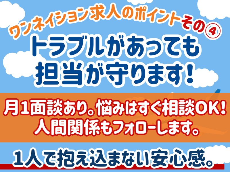 職場環境 当社には専属のサポート担当がいます。 あなたの不安を理解して勤務先と 交渉や相談を行います。 派遣先に配属という形で働いて いただきますが、 一人ではありませんので 安心してくださいね。 また、当社は自由参加でイベントを 定期開催しています! 喫煙所:喫煙所あり(屋外)