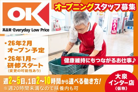 仕事内容 【 お仕事内容 】 ★夕方~夜だけ/短時間OK♪ ★Wワーク・副業歓迎! ★接客なし/裏方作業! <おまかせするお仕事はコチラ!> *お客様サポート ・「〇〇はどこですか?」といった売り場のご案内 ・お会計後の荷物運びのお手伝い ・カートやベビーカーの操作補助 など お客様からの「ありがとう」が直接もらえる、 やりがいのあるポジションです♪ *カート・カゴの回収 店内や駐車場に置かれている カートや買い物カゴを集めて、整えるお仕事! 軽く身体を動かせるから、健康にも◎ 【 オーケーの魅力♪ 】 ■お仕事終わりにそのままお買い物OK♪ 「時間も手間も節約できて助かる!」 そんな嬉しい声がたくさん届いています! 夕方シフトのあとに そのままお買い物できて便利◎ ■自分のスタイルに合わせて 週2~5日の勤務で、 ムリなく続けられる働き方が可能です! ■どんなライフスタイルの方にもフィット! ◎授業やサークルの後に働きたい♪ 「夕方だけ×短時間」のシフトなので 勉強との両立もバッチリ! ◎無理なく健康的に働きたい♪ 短時間なので体への負担も少ない! 日中の用事が終わった夕方に ちょっと体を動かしてリフレッシュ! ◎Wワークをしたい♪ 午前中は他のバイトをして 夕方だけの勤務でもOK! ■ゆとりある人員配置で安心 1店舗あたり社員さんが22~23名いるので わからないこともすぐに相談できて安心♪ 業界的にも社員数が多い職場だから、 とっても心強いですよ! 【 しっかりした研修あり 】 \\2026年1月から研修スタート!// 新店オープンに向けて、 しっかり準備ができる体制が整っています! <事前研修あり> ・他店舗での“お試し勤務”で現場を体感! ・合同研修で仲間と一緒に学べる♪ ⇒既存店舗で、仕事のやり方やルールまわりなど 基礎から実践までじっくり身につけられます! < オープン後のサポートも充実> ・経験豊富な社員がしっかりサポート! ・分からないことも、すぐに聞ける環境◎ ⇒オープン初日から1人にさせない安心の職場です♪ 【 大泉インター店へのアクセス詳細 】 <バスの場合> 国際興業バス「比丘尼橋」下車、徒歩1分 ・地下鉄成増駅から乗車の場合 「成増駅南口」バス停から14分 ※平日は1時間に5本~6本 休日は1時間に4本~5本 ・石神井公園駅から乗車の場合 「石神井公園駅北口」バス停から15分 ※平日は1時間に4本~6本 休日は1時間に3本~5本 <徒歩の場合> 西武池袋線「大泉学園駅」から徒歩25分! 西武池袋線「大泉学園駅」北口を出て グランエミオさん手前のエスカレーターを降ります。 そのまま東急リバブルさん方面へ直進し、 交差点を右に渡ります。 靴流通センターさんを通り過ぎ、1つ目の路地を左折。 すぐに右折し、道なりに進むとT・ジョイさんが見えてきます。 T・ジョイさんを過ぎ直進し 大通りに出ると左手にお店があります。 ※自転車通勤応相談 【 勤務形態について 】 この求人はアシスタントパートナー社員の募集です! アシスタントパートナー社員とは? アルバイト・パートとして、週20時間未満で働く 扶養内勤務可能な勤務形態です! ※アシスタントパートナー社員以外には パートナー社員という働き方もあります。 社会保険に加入でき、週20時間以上働く勤務形態です。 週40時間のフルタイム勤務など 契約社員のような働き方も可能です。