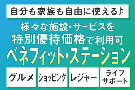 【保険制度】 雇用保険、労災保険、健康保険、厚生年金 待遇・福利厚生 【福利厚生】 ・社会保険完備 ・交通費全額支給 ・バイク、自転車通勤OK ・ガソリン代補助あり ・有給休暇(取得率高め!) ・制服貸与 ・空調あり ・屋内禁煙(屋外に喫煙場所あり) ・結婚祝金、出産祝金、扶養 こども手当、入学祝金、退職金制度などの福利厚生が充実(規定) ・紹介キャンペーン ※ご紹介くださった方1名につき5万円を進呈(規定) 【ベネフィット・ステーションの利用が可能】 ベネフィット・ステーションとは、 様々なシーンでご利用いただける 総合型福利厚生サービスです。 映画鑑賞やホテルディナー、宿泊施設 などの余暇・レジャー関連をはじめ、 日常で使えるフィットネスや 育児・介護支援、ライフサポートなど 約140万件以上の幅広いメニューを お得な価格で利用できます。 <サービス例> ・全国40,000以上の宿泊施設 ・全国30,000店舗以上の飲食店 ・全国約7,700ヶ所のスポーツクラブ など スタッフさんはもちろん、ご家族の方もお好きなだけ利用できます。