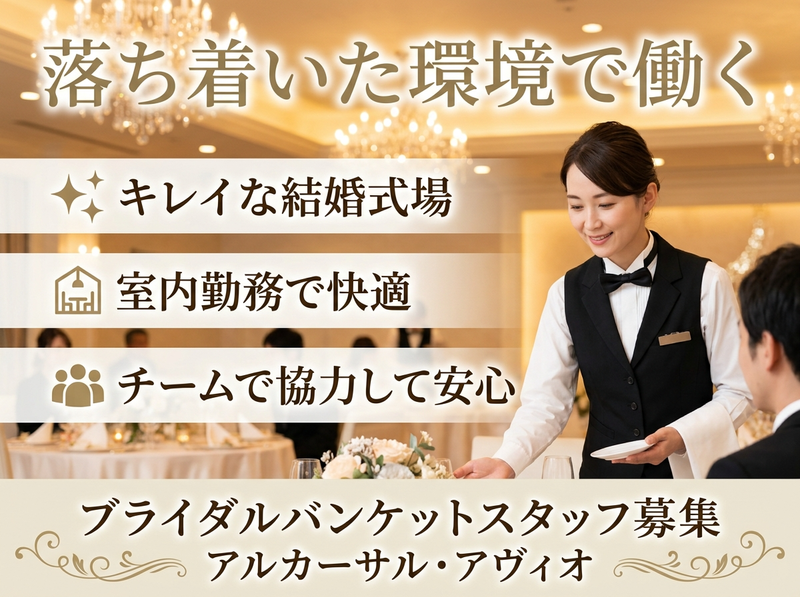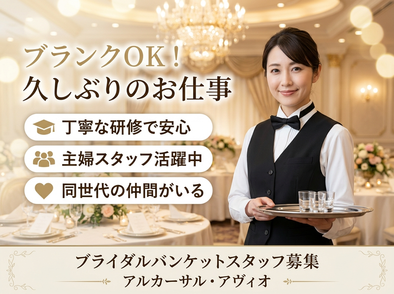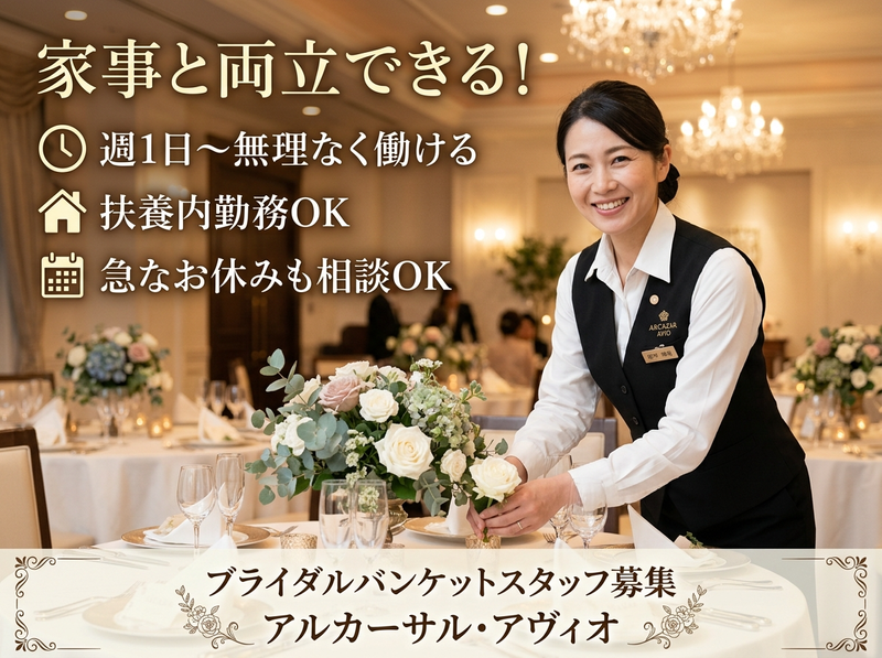 選考プロセス ⭐応募後、担当者よりご連絡いたします 面接日程を調整のうえ、結婚式場にて面接を行います。 ⏩面接は1回のみ 堅い面接ではなく、働き方やシフトについて気軽にお話しする雰囲気です✨ ✨久しぶりの面接でも安心 難しい質問はありませんので、リラックスしてお越しください。 ⏩お子様連れでの面接も相談OK ご家庭の事情に合わせて柔軟に対応します❗ ❗応募から採用までスムーズにご案内します 「まずは話を聞いてみたい」という方も大歓迎です✨ 【⭐入社するメリット】 ⭐家庭と両立しやすい働き方 週1日~・短時間OKで、家事や育児と無理なく両立できます✨ ⏩扶養内で安定した収入を確保 シフト調整で収入をコントロールでき、家計のプラスに◎ ⏩ブランクがあっても安心スタート 簡単な業務から丁寧に教えるので、久しぶりのお仕事復帰でも安心です❗ ⏩落ち着いた室内勤務で安心 天候に左右されず、キレイな結婚式場で快適に働けます✨ ⏩人とのつながりができる チームで働くため、自然と会話も増え、安心して続けられる環境です。 【⭐よくある質問(Q&A)】 Q. 子どもがいるのですが働けますか? A. はい、大丈夫です。学校行事や急なお休みなども柔軟に対応しています。 Q. 扶養内で働けますか? A. 可能です。シフトで収入を調整できるのでご安心ください。 Q. 久しぶりの仕事で不安です… A. ブランクのある方も多く活躍しています。丁寧にサポートしますので安心してご応募ください。 Q. どのくらいの働き方が多いですか? A. 週1~2日、短時間で無理なく働く方が多いです。 Q. 立ち仕事は大変ですか? A. チームで協力して進めるため、一人に負担が偏らないよう配慮しています。 【面接地・登録地】 アルカーサル・アヴィオ 所在地:福岡県福岡市東区水谷2丁目52−8 担当者:バンケットスタッフ採用担当 電話番号:0926650077