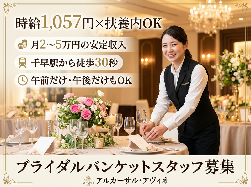 仕事内容 千早駅徒歩30秒の結婚式場「アルカーサル・アヴィオ」にて、 披露宴やパーティーのサポート業務をお任せします。 難しい作業はなく、未経験の方でも始めやすいお仕事です✨ 【主なお仕事内容】 ⏩料理やドリンクの配膳 ⏩テーブルセッティング・会場準備 ⏩ゲストのご案内 ⏩披露宴中のサポート業務 ⏩終了後の片付け ✨最初は先輩スタッフが丁寧に教えるので、久しぶりのお仕事でも安心です。