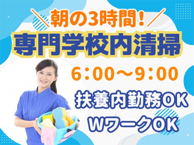 仕事内容 <早朝の3時間で働けます!> 簡単な短時間清掃のお仕事 パート・アルバイト募集! 専門学校内の簡易清掃です。 <オススメポイント!> ・すきま時間で働ける ・WワークOK ・扶養内勤務OK ・未経験OK ・主婦(夫)・フリーターさん活躍中 <お仕事について> 仙台市若林区にある専門学校内での 簡単な清掃をお願いします。 ・掃き、拭き掃除 ・ゴミ回収 ・トイレ清掃 など 特殊な作業や、複雑な作業はナシ! 清掃業務が未経験の方も、 家事の延長でできますので、 すぐに活躍いただけます! <勤務地> 滋慶学園 第二校舎 (仙台市若林区新寺2丁目1-11) 地下鉄東西線 宮城野通駅から徒歩6分 駅チカで通勤に便利な好立地! <勤務は朝の短時間のみ> 勤務は6:00~9:00 午前中の3時間だけになります。 空いた時間を有効利用できます! もちろんWワークもOK! 家事と両立したい主婦(夫)さん、 フリーターさん活躍中! <幅広い年齢層が活躍中> 清掃のパート・アルバイト未経験者から シニア層、主婦(夫)、子育て中の方など 様々な年齢層の方が働いております! <清掃未経験もOK> 清掃のお仕事が未経験の方、 パート・アルバイトの経験がなくても スタッフが丁寧に指導いたしますので 安心して働けますよ! 清掃作業は大変なイメージがありますが、 お客様の快適な毎日を支えるやりがいのあるお仕事です。 まずはお気軽にお問い合わせ、ご相談ください!