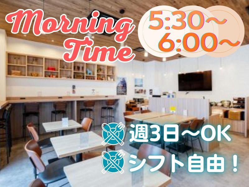 勤務時間詳細 ▽週3日~OK!土日勤務は大歓迎!▽ ⏰朝5:30~10:30 または ⏰朝6:00~11:00
