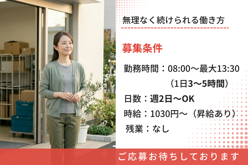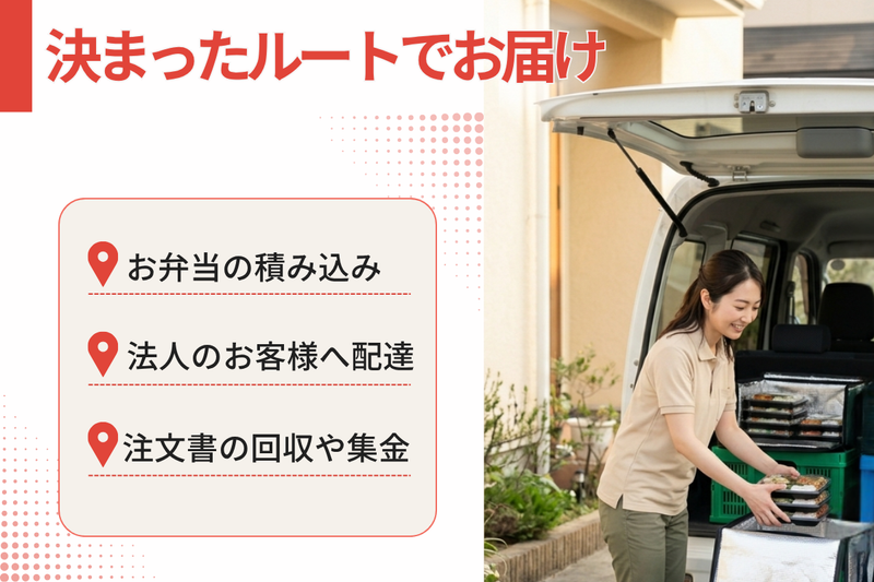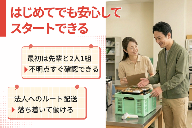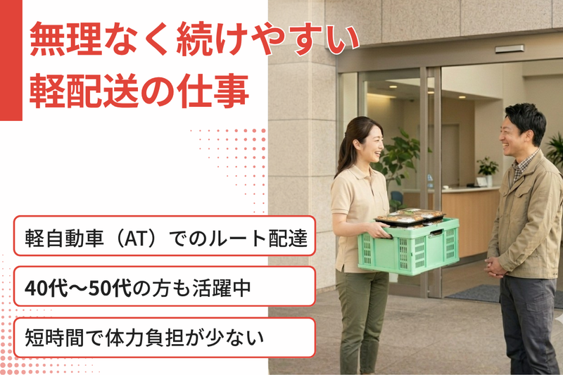 仕事内容: \週2日~勤務OK/ ・・━━・・━━・・━━・・━━・・━━・・━━・・ お昼までで無理なく働ける✨ 軽自動車での《お弁当配達スタッフ》✅ ・・━━・・━━・・━━・・━━・・━━・・━━・・ 手作り弁当を法人向けに届ける 安定したサービスを支えるお仕事♪ 今回は 普通免許(AT限定可)で始められる 《配達スタッフ|アルバイト・パート》を募集します✨ ━━━━━━━━━━━━━━━━ ┎────┒ 仕事内容 ┖────┚ 決まった企業や幼稚園へ お弁当をお届けするルート配送です♪ ★ 具体的には…★ ⏩ お弁当を車に積み込む ⏩ 決まったルートで配達 ⏩ 商品のお渡し ⏩ メニュー表の配布 ⏩ 注文書の回収・集金 同じ流れを繰り返すので 覚えやすく安心です◎ \未経験でも安心✨/ 最初は先輩と2人1組でスタート! ルートや仕事の流れを 一つずつ覚えていけます♪ ━━━━━━━━━━━━━━━━ ┎─────────────┒ 働きやすいGOODポイント ⭐ ┖─────────────┚ ◇ 短時間勤務で終了 ✅  ̄ ̄ ̄ ̄ ̄ ̄ ̄ ̄ ̄ ̄ ̄ ̄ 勤務は08:00~最大13:30まで◎ 週2日からでOK!! 残業もなく、無理なく続けられます♪ 短時間から始められるので主婦(夫)の方も気軽に働くことができます◎ 「子どもを送り出したあと、午前中だけ働きたい」 「体に負担の少ない仕事で、無理なく長く続けたい」 そんな方にぴったりのお仕事です♪ ◇ 体への負担が少ない ◇ 安心して始められる環境 未経験スタート多数! まずはお気軽にご応募ください✨