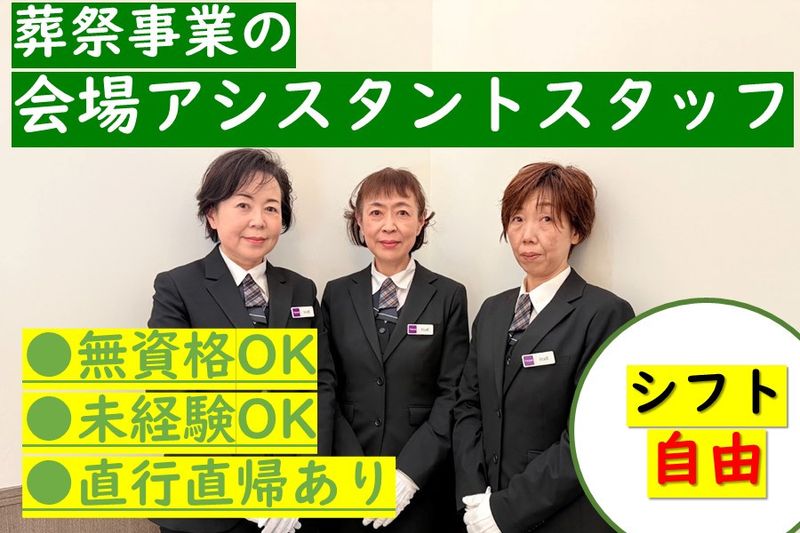 【アピールポイント】 葬祭事業の会場アシスタントスタッフを募集します! 【未経験からでもキャリアアップが目指せます】 ■無資格OK ■直行直帰OK ■学歴不問